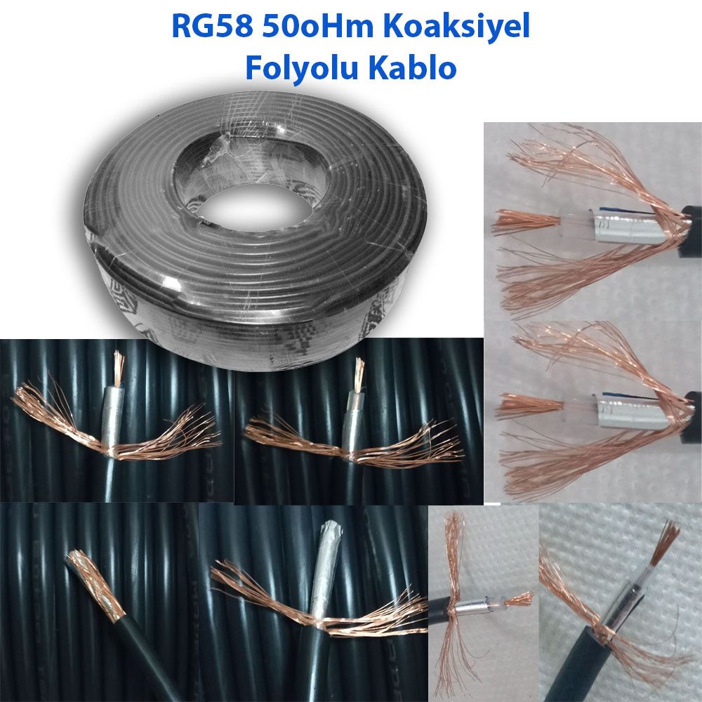 RG - 58/U Koaksiyel Kablo, Kalaylı Saf Bakır. (Folyolu Kablo Olduğundan Sinyal Kaybı Klasik Kablolardan Daha Düşüktür).